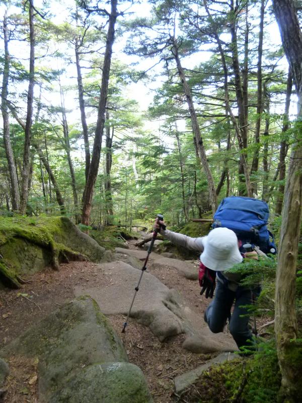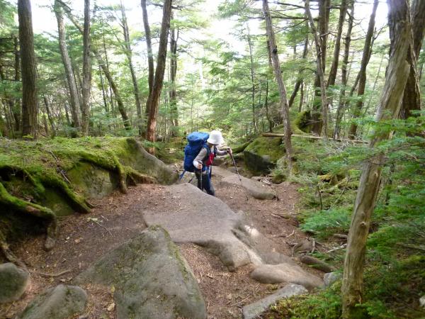 押手川到着段階で時間が押していたので、編笠山の登頂は諦め、巻き道から青年小屋に向かいます。地図だとそんなに急登は無いのですが、岩がごろごろしているので慎重に歩きます。