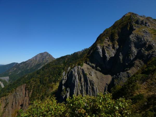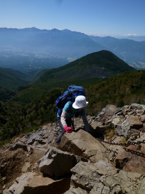 樹林の中を急登して、一旦見晴らしの良い個所に出ます。ここから権現岳までにガレ場、鎖場が出てきます。