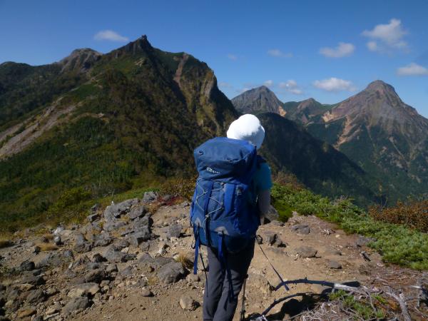 急降下し、三つ頭に向かってゆるく登り返すと展望抜群のピークに出ます。振り返る見る赤岳と権現岳がカッコ良いのです。