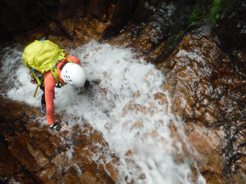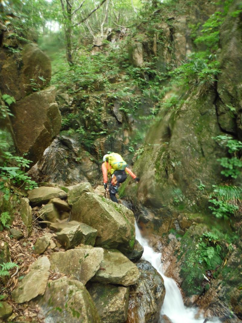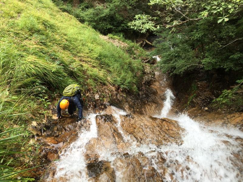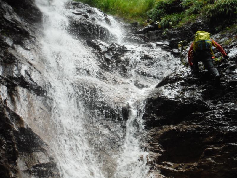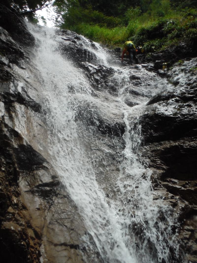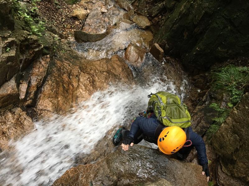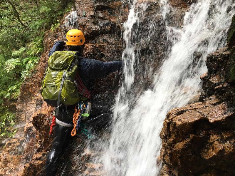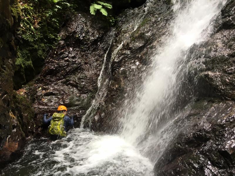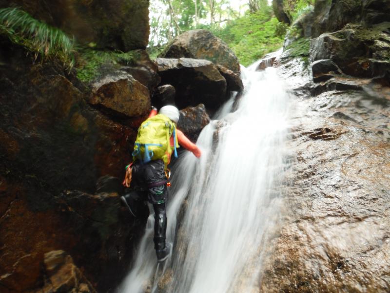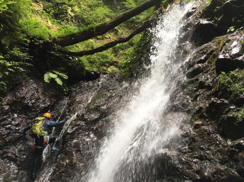 この沢はほとんどが登れる滝でほど良い緊張感のなかシャワークライミングを楽しめます。