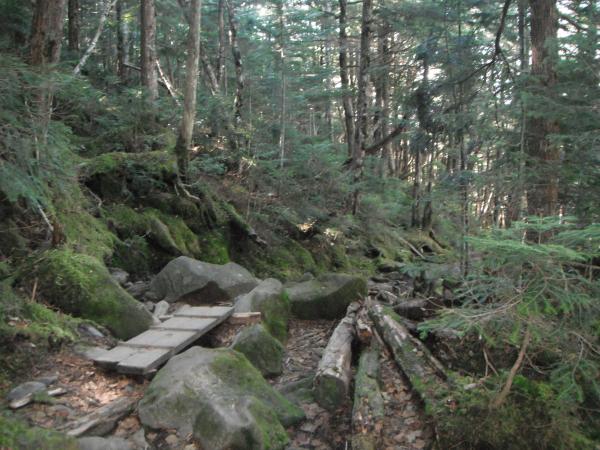 黒百合平から渋の湯への道は岩に着いたコケに注意。滑りやすいです。