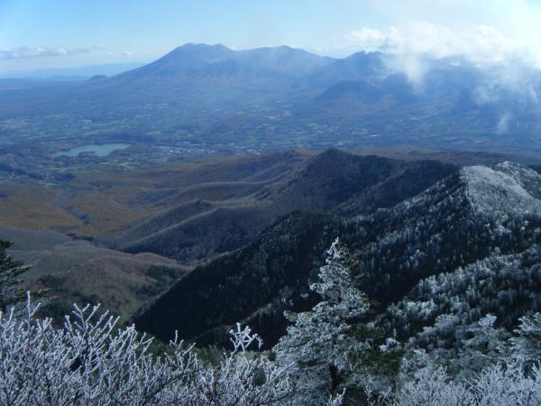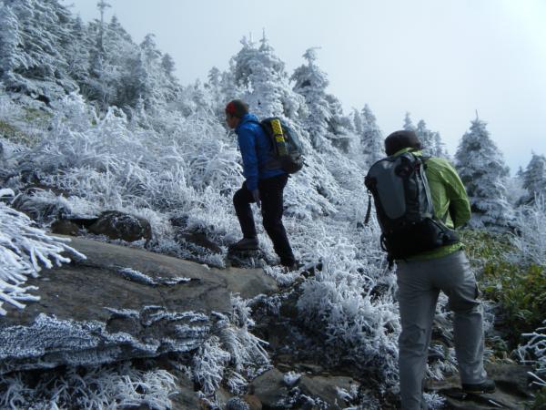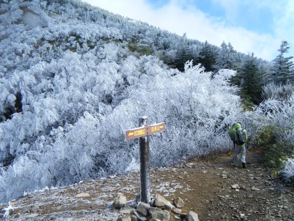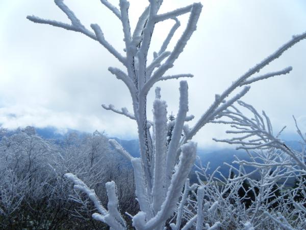 下から見上げて白っぽい木々が多く、まさか雪じゃないだろうと思っていたら見事な霧氷が付いていました。