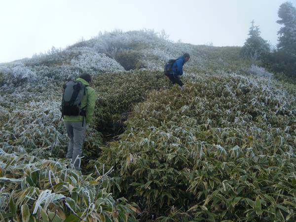 鞍部から根子岳に登る道は笹原の中を行く良いルートです。寒かったですが。