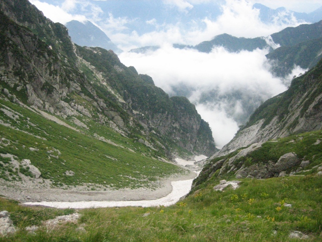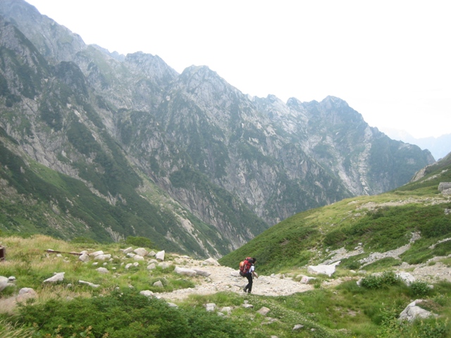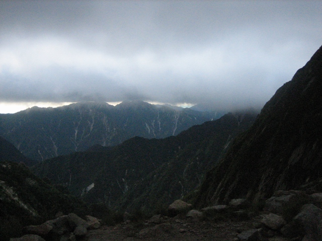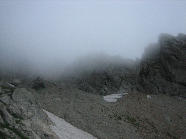 撤収後、長次郎谷を下っていると、突風が吹き出し、落石が各所で起きたりしていました。剣沢のテン場に来ると濃いガスの中で、雨が降り出しました。別山乗越でどうやら、台風が本土上陸するらしいという話を聞きました。