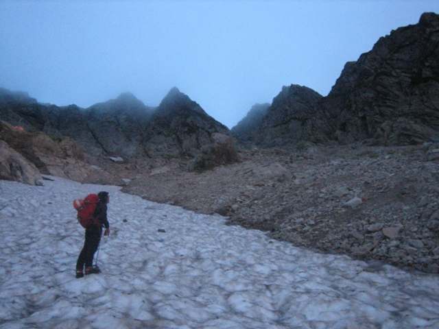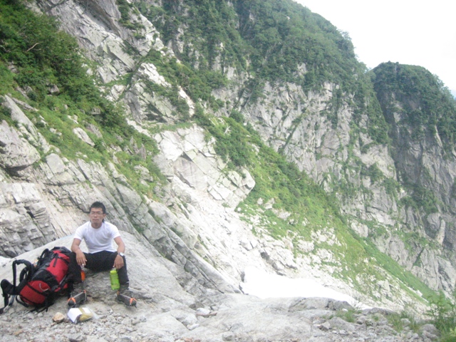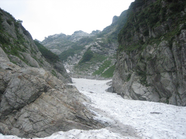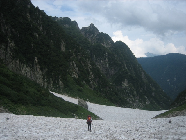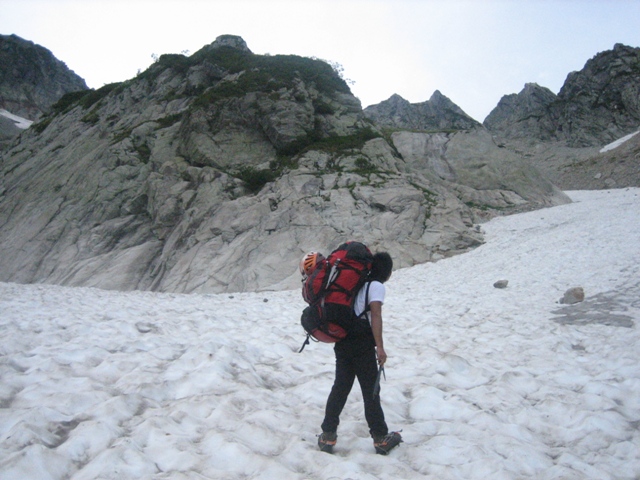 - 剣沢を下るには途中から雪渓に降り、アイゼンを付けた方が歩き易いです。しかし歩く箇所によっては小さいシュルントがあいています。長次郎谷は八つ峰Ⅰ・Ⅱ峰間ルンゼの出合の上部が雪渓が切れており、滝が出でいます。上部に向って左岸から巻き、滝の手前で右岸に渡り、切れている箇所を巻きました。滝の上部にシュルントがあいており、注意が必要です。尚、雪渓から岩場などに移る場合も、場所を確認して下さい。危険です。