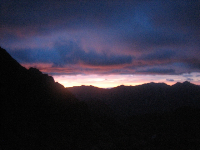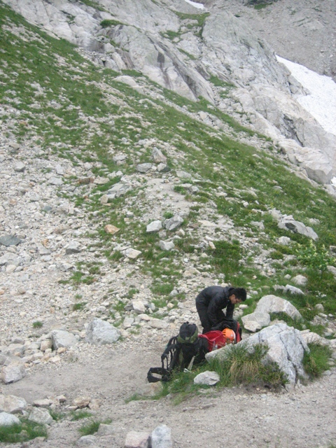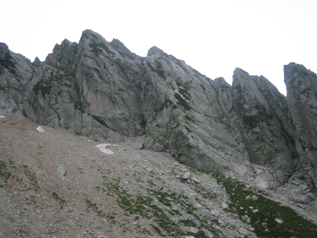 2日目池ノ谷乗越に向いましたが、あまりに西の空から灰色の雲が勢い良く流れており、稜線上は濃いガスの中という状況でした。雨はまだ降っておらず、どうするか相談し気が乗らないので、中止にしました。