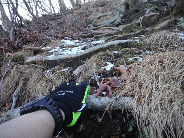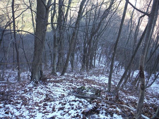 ・クリーンセンター~鶏鳴山:標高700m辺りまでは不明瞭でリボン等もほぼ無し。尾根の入り方に気を付けないとあらぬ方向に進んでしまう。中山尾根と別れる辺りからは踏み跡あり。鶏鳴山直下は南側の尾根以外急登。特に北は凍結しやすく登降共に注意が必要でメンバーによっては確保具が欲しくなる。