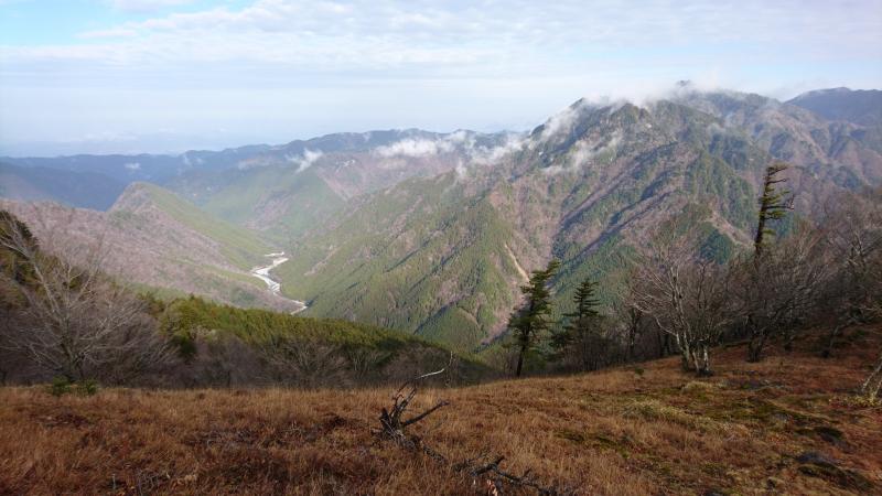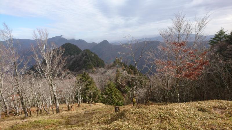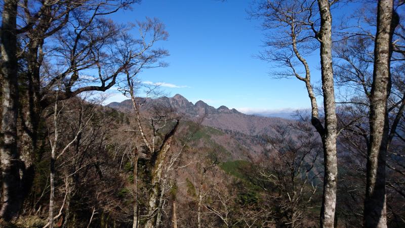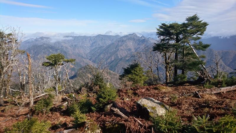 まずは鉄山の山頂を目指して一気に登って行きます。鉄山までは山と高原地図にもルートが表記されているので迷うことはないと思いますが、誰が名付けたかこの登りは”大峯三大急登”に数えられている様で、根気よく登って行きます。登っている間、自分の後ろに今日目指すべき行者還岳が見え、心を折られそうになりますが登って行きます。途中、笹っぱらを過ぎていき、数度の登りを繰り返せば鉄山です。山頂からは景色はほとんど望めません。