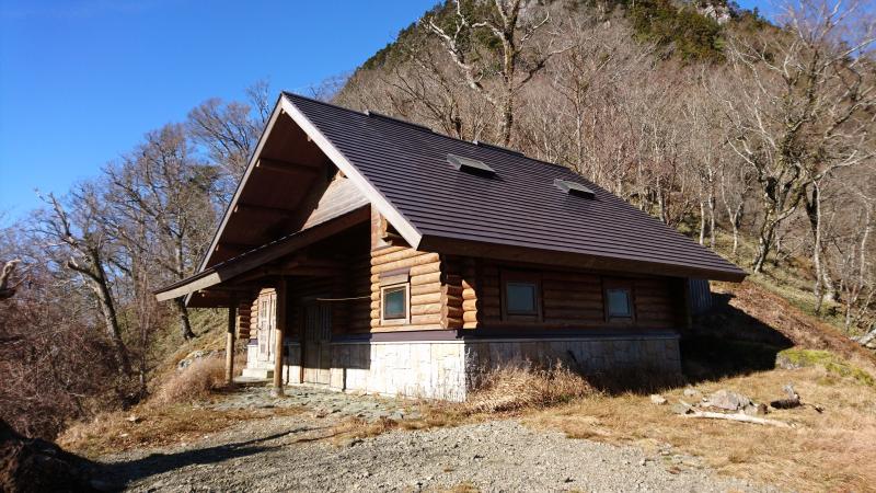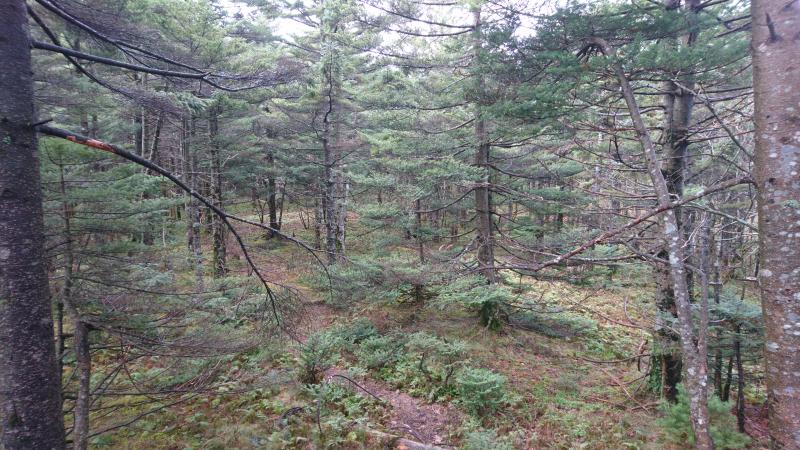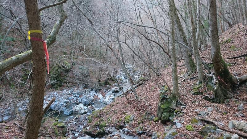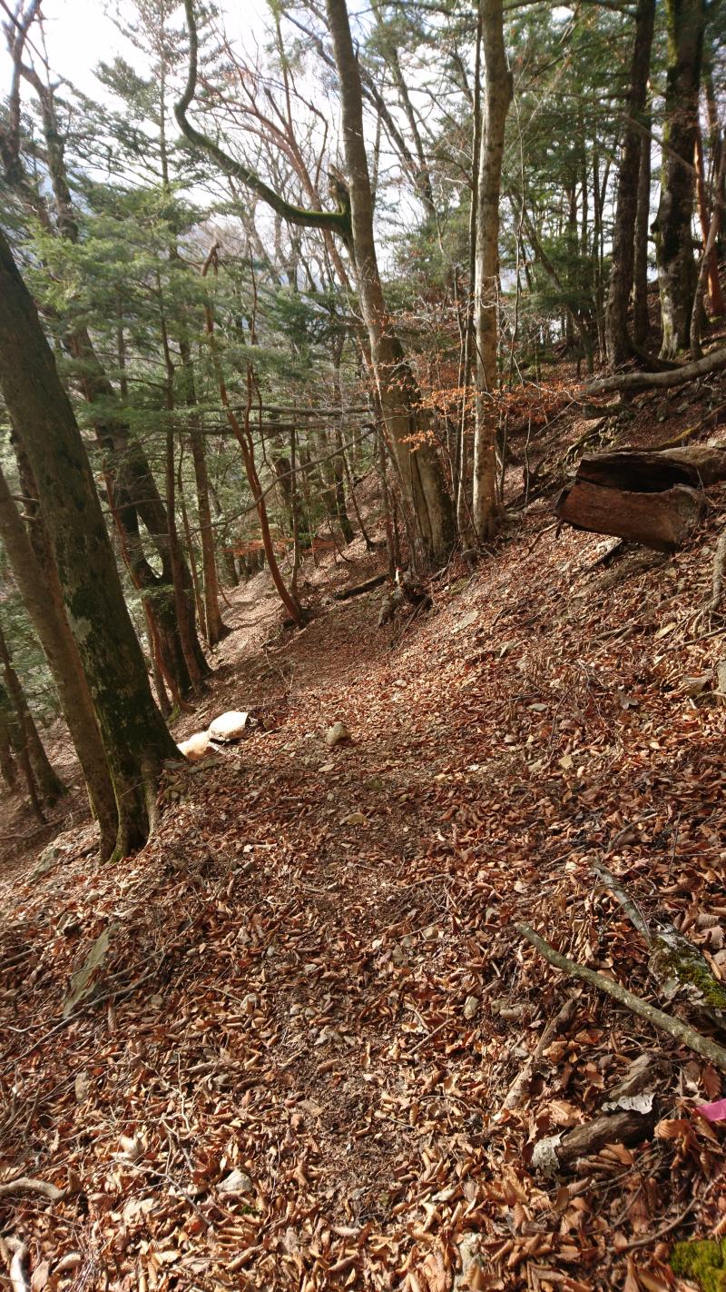 山頂をあとにし、避難小屋へ戻って小休止をし、下山を始めます。一旦天川辻へ戻り、そこから針路を西へとり沢へ向けて一気に下ります。このルートは数年前遭難事故があったこともあり、目印になるテープは多く張られています。ただ、道の状態は悪く、特にトラバースが連続する場所ではまっすぐ足を置くことができないため、バランス力も必要になります。