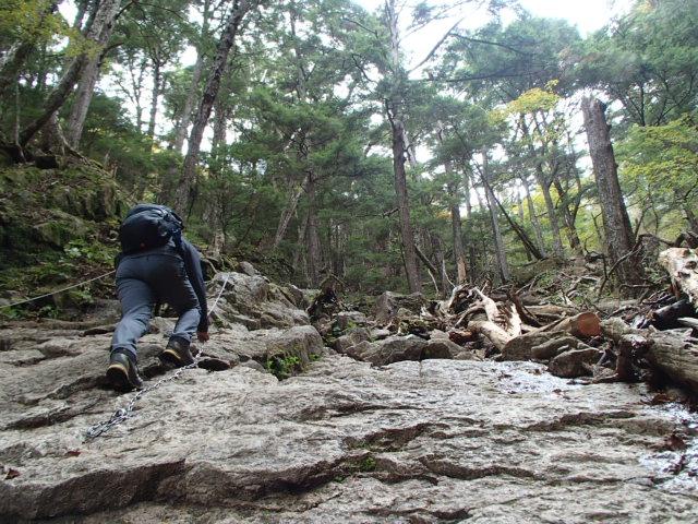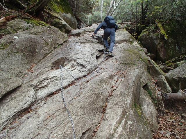 ・桃太郎岩の横に設置されている階段を登って先に進むと、鎖の配された岩場に出合います。雨上がりなどには結構滑りそうな雰囲気。足元に注意しながら、楽しく登って行きます。角度はそんなにないのであまり怖さはありませんが、注意は必要です。