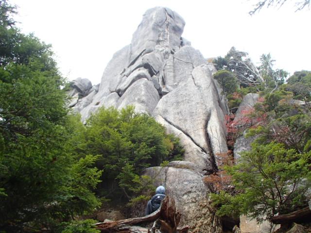 ・徐々に登りが急になって行き、大きな岩も増えていきます。一歩一歩楽しみながら進んでいくと、前方に巨大な岩峰が現れます。この山の象徴にもなっている岩峰です。ここでクライミングを楽しむ方もいるようです。基部からの写真を撮り、感嘆しながら登って行きます。