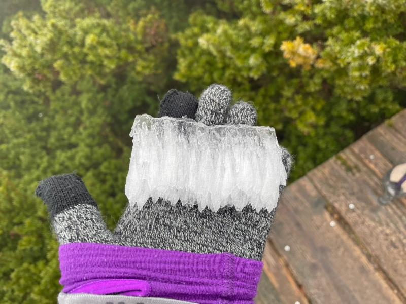 八合目手前から霧氷が多くついていました。明け方出発した先行パーティの方いわく、山頂付近は木道がしっかり凍っていたとのこと。我々が山頂付近に到着した昼前ごろの時間には、あまり凍ってはいませんでした。