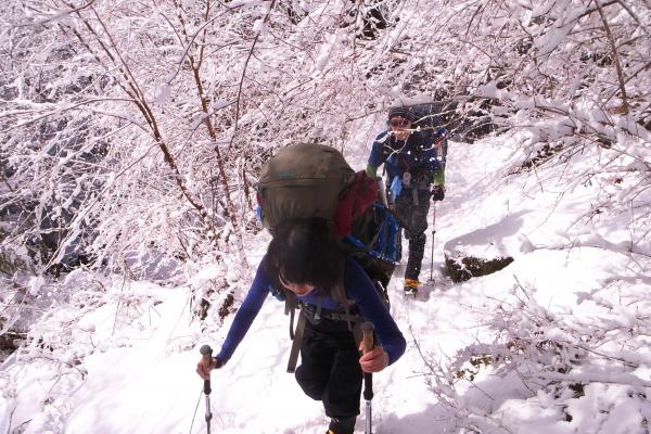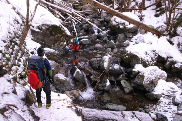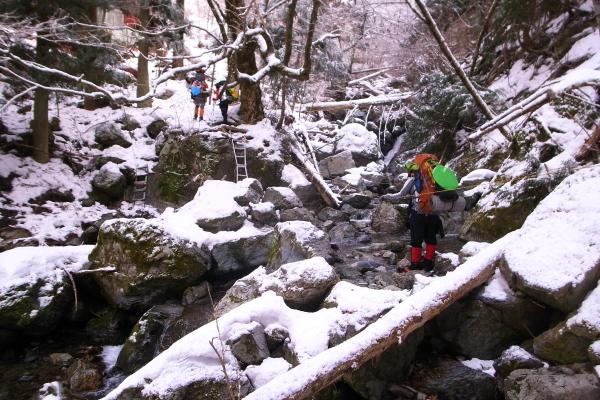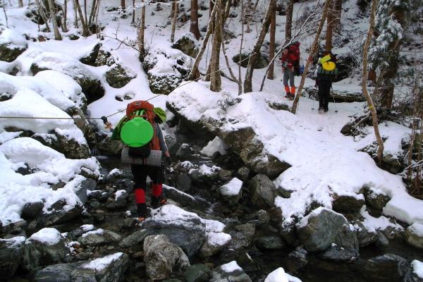 - 秋に来たときに、石はごつごつ、木が倒れと歩きにくかった箇所は今回は雪で覆われ快適に歩けました。駐車場からしばらくは地面が凍っているくらいで、雪はほとんどなくその先もトレースがあるので歩きやすいです。渡渉が数回あり、雪質は固め。6本以上のアイゼンが必要です。