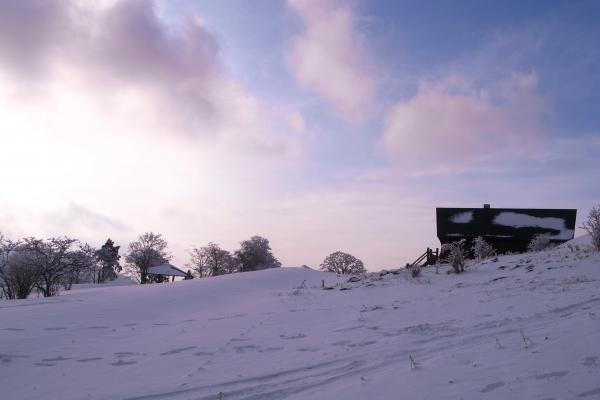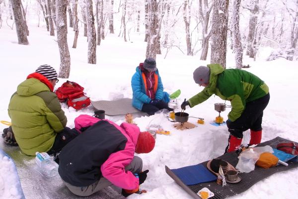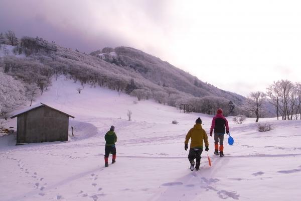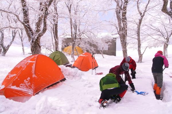 小屋の裏で風を避けてテント設営、ソリ遊びを堪能。みんな子供みたいにはしゃいでいました。