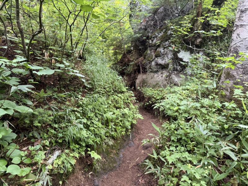 尾根から沢に向かって降りて行く箇所が急斜面で、