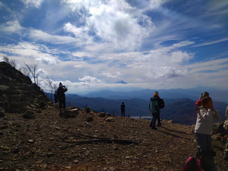 上日川峠からはノンビリと歩いても20分ほどで「福ちゃん荘」。テント場・水場・売店・食堂もあり、もちろん宿泊も可能です。ここは大菩薩峠方面と唐松尾根の分岐にもなっていて 今日は「牛奥ノ雁ヶ腹摺山」が目的ですが折角なので唐松尾根から「大菩薩嶺」を目指します。唐松尾根は稜線手前で斜度が増しますが終始歩きやすい広い登山道が続くのでマイペースに歩くとよいでしょう。上日川峠からものの1時間程度で「雷岩」に到着です。「雷岩」からは早速、富士山を望むことができ まだ山を登り始めたばかりのような人が大はしゃぎ。(うん。うん。あったあった。私も前はそうだったよ…)そんな微笑ましい風景を見ているとこちらも楽しくなってきますよね!「雷岩」から「大菩薩嶺」は往復15分程度。「雷岩」から「大菩薩峠」までは右手に「富士山」を携え眺望の良い稜線を歩きます。どこで泊まっても右に「富士山」。贅沢な場所です。