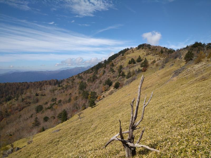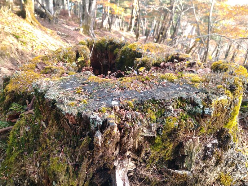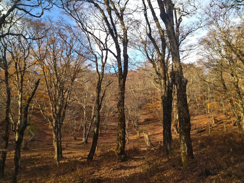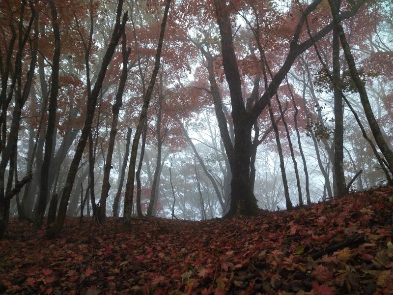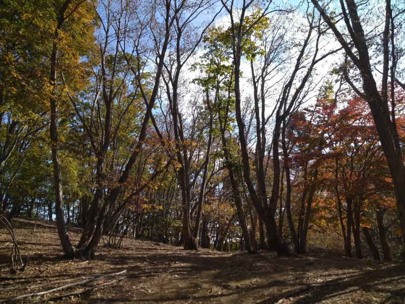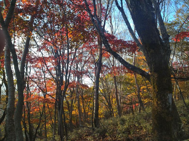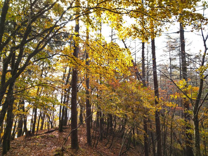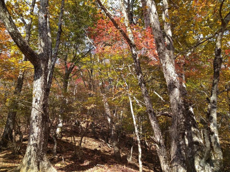 「湯ノ丸峠」からは緩い昇り降りを繰り返しながら進んでいきます。晴れていれば富士山の眺望もさぞいいことでしょう。途中に「ハマイバ」と言うピークがあるのですが漢字表記だと「破魔射場」だそうです。男子的にはこっちのがカッコイイと思う人が圧倒的多数なんじゃないでしょうか。米背負峠」あたりは紅葉ピーク!!とてもキレイな風景にテンション上がりまくりました。「大谷ヶ丸」で分岐するのですが山頂のちょっと北側に分岐があります。山頂から下ることも可能ですが踏み跡は落ち葉で隠れてなのか確認できませんでした。その後もルートに乗っているはずなのに落ち葉の為か元々なのかはわからないのですが「不明瞭」な道が続きます。とはいえ、尾根通しなので現在位置の把握をして進む進路を間違えなければ問題ないはず…そう!「読図」が出来ればいいのです! 登山アプリ(山と高原地図、ヤマレコ、ヤマップなど)か地形図対応の地図アプリ(ジオグラフィカ、コンパスなど)があると「地図読み」が出来なくても迷うことはないでしょう。こう言った低山の一般登山道でも「読図力」が必要、役に立つ部分はありますので 「読図」を勉強しておきましょう。