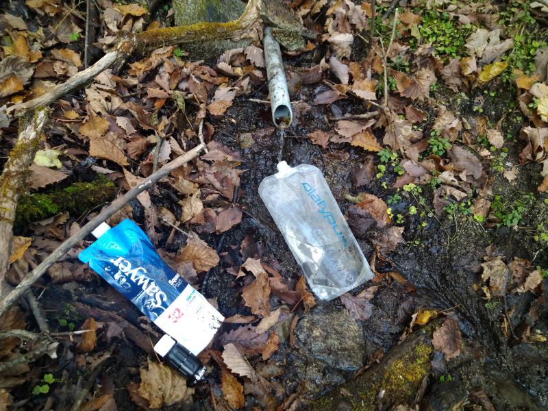 湯ノ沢峠下の水場は細い。砂も混じります。