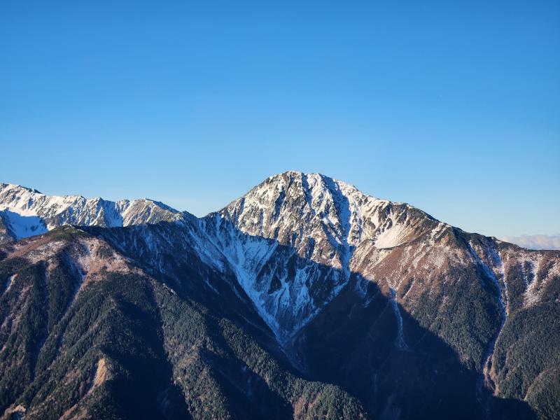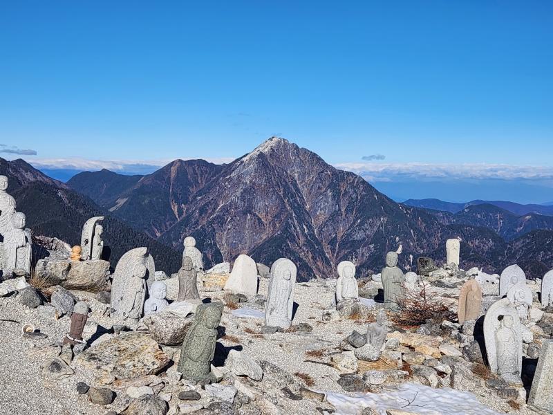 数年前に訪ねた時は曇りだったので、今回は360°の絶景が楽しめました。特に雪を被った白峰三山は圧巻で、北岳の東面が顕著に見えたのがとても印象的です。私は縦走中ずっと隣の白峰三山を眺めていました。地蔵岳が近付くと、北側の景色はさらに広がり、仙丈ヶ岳や先月登った甲斐駒ヶ岳が見えてきました。山の上から登った山を眺めるのは非常に感慨深いです。登った山が増えるほど思い出に浸って立ち止まる時間が増えてしまうので、歩くのに時間がかかります。楽しみは増えますが時間配分には気を付けねば。