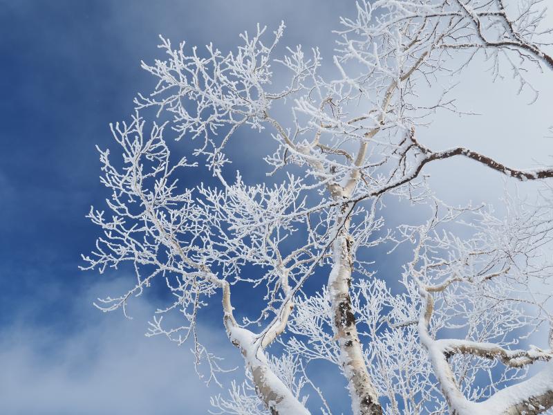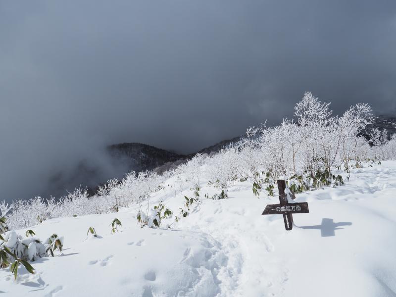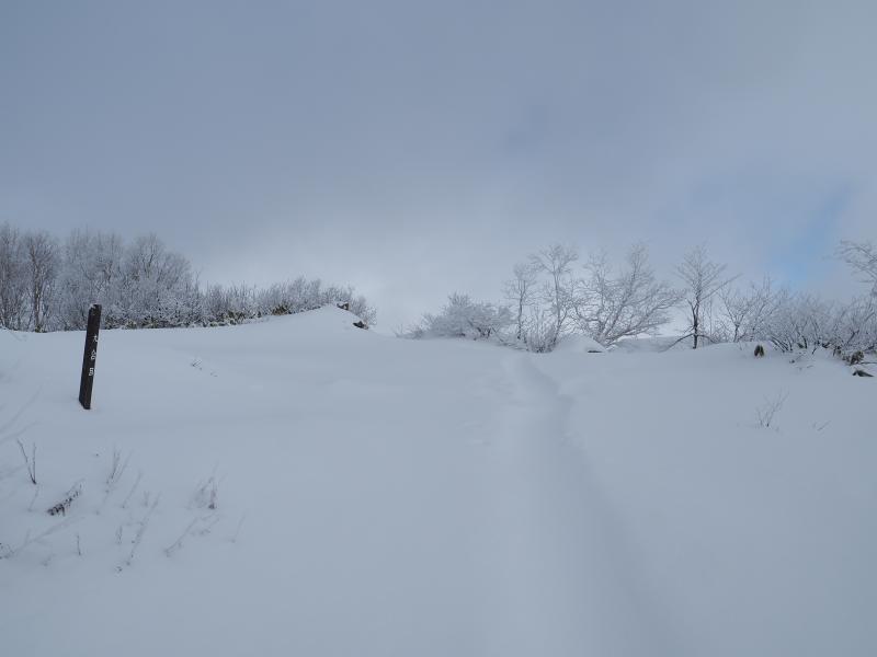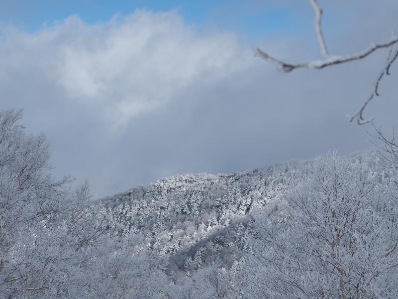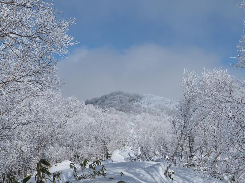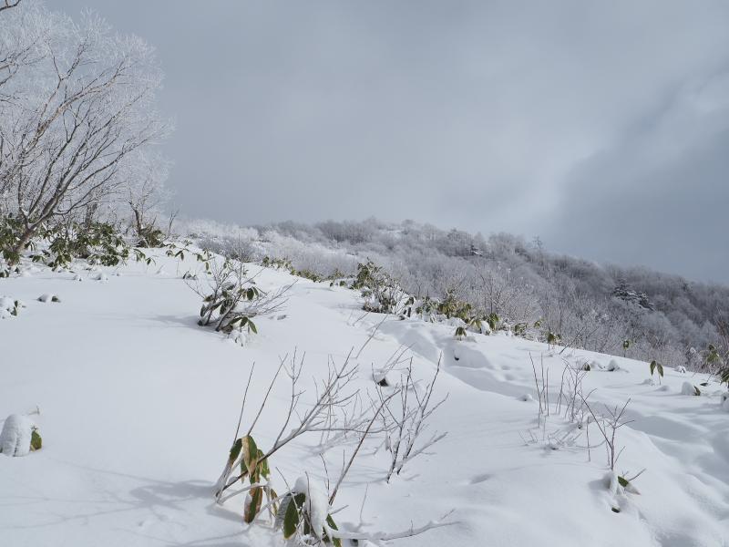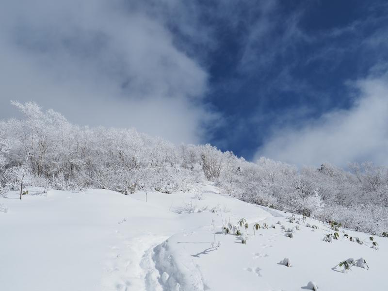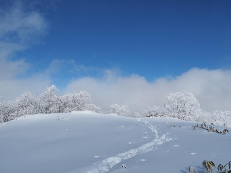 北側に青空が見えてきて、霊仙寺山方面に少し進むも雪が多くてトレースもなく膝辺りまで埋まってしまうので引き返しました。霊仙寺山に行くにはスノーシューやワカンが必要でしたね。山頂で少し青空待ち。やっと青空が見えてきて青空の雪のコントラストが最高!周りの山が見えるほど雲は取れなかったので下山します。
