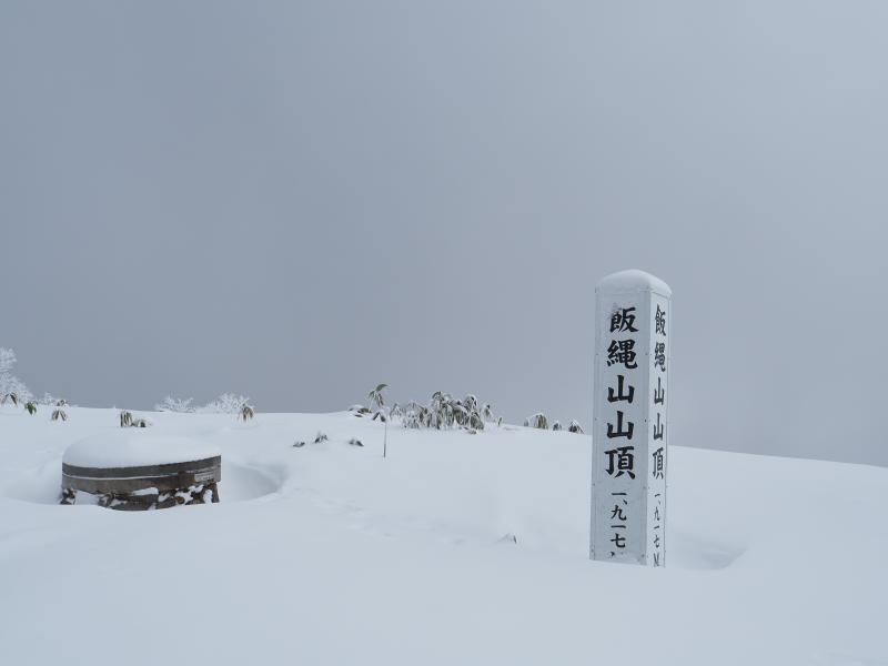 さてさて登山口から雪スタート。気温はそこまで下がっていないのでツボ足で。前日夜は長野市では雨でしたがやはり山では雪でしたね。新雪に樹氷で美しい。まだ雪はそこまで多くないので夏道ルートで歩けました。標高が上がってきて新雪の量が増えてきてズルズル滑る感じも出てきたので1745m辺りでチェーンスパイク装着。樹林帯を抜けて飯縄山南峰が見えてきました。登山口付近は晴れてましたが、上部は曇り空でモノトーンの景色。太陽を感じる時はあれど青空が見えません。南峰付近は脛くらいまで埋まる積雪量。飯縄神社に立ち寄り飯縄山北峰へ。登頂するも青空は見えず。。。