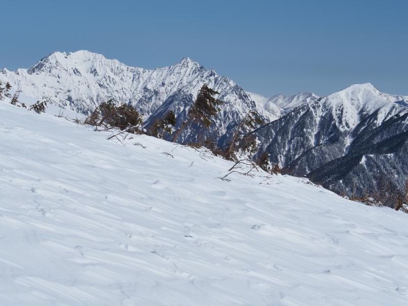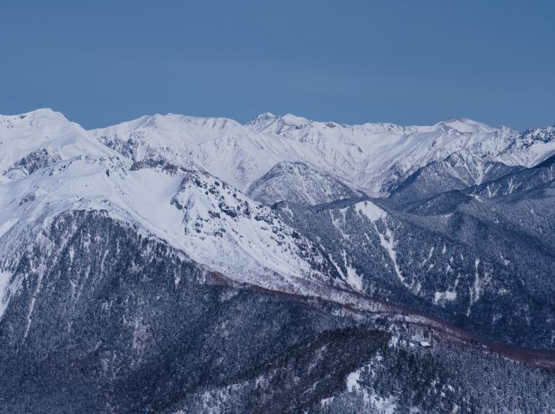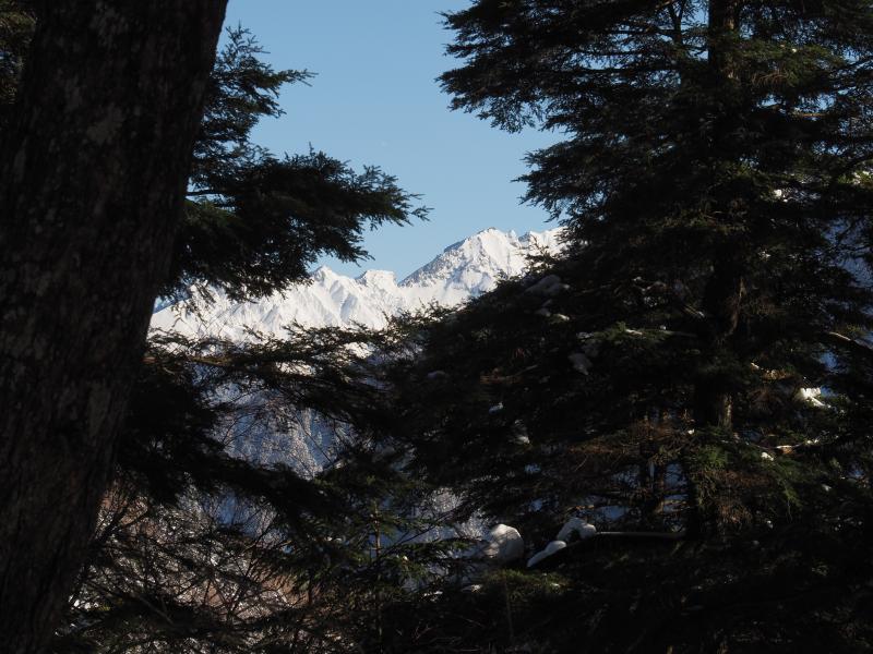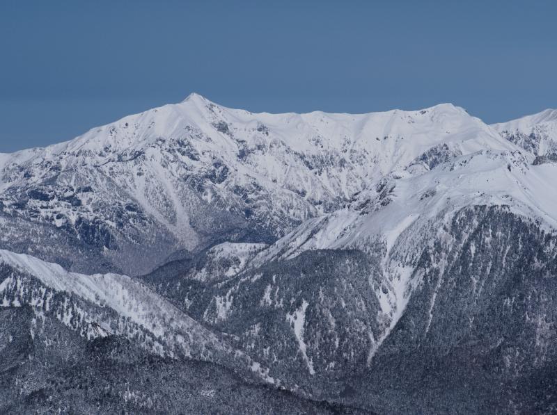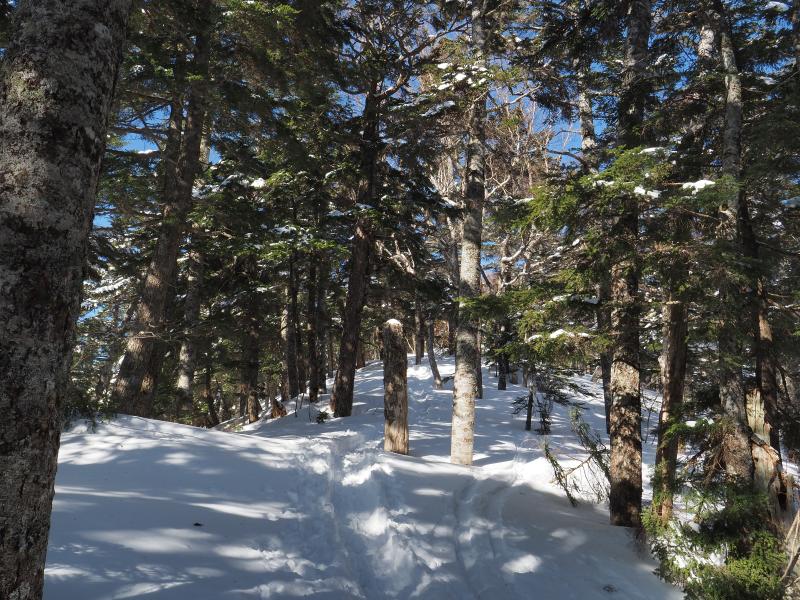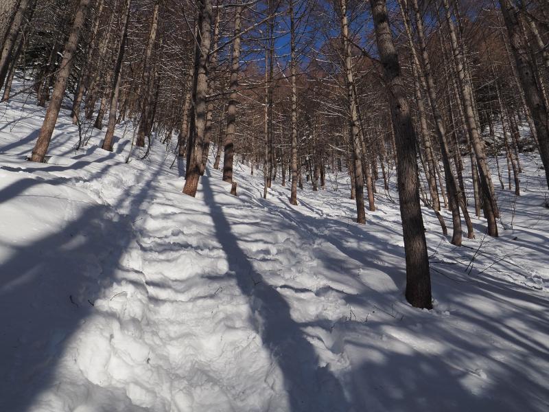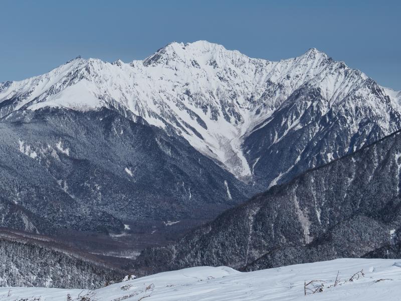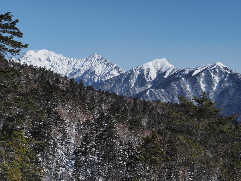 白骨温泉から歩いて登山口へ。登山口に車停められたのか、下調べ不足。。。登山口から雪ありですが、登山口近くの登山道は一部無くなるところも。その後はしっかり雪も付いていてトレースもありなのでアイゼン装着。序盤からまあまあの急登の樹林帯。ここ最近まともに歩いていなかったので歩いては止まり、歩いては止まりの繰り返し。そして急登が終わったら次は平坦に近い緩やかな道。スノーシューだと縦横無尽に歩けそうですが、アイゼンではトレース外すと踏み抜きます。途中木々の隙間から真っ白な穂高が見えていました。森林限界を抜けた景色に希望が膨らみます。