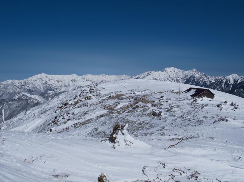 まただんだんと登りの斜度が増してきます。ここでもまたもや歩いては止まりの繰り返し。青空が近づいてきてようやく森林限界突破。振り返ると御嶽山に、八ヶ岳。そして最後の登り。左手には乗鞍岳主峰、右手には奥穂・前穂高岳。登り切ると平になり乗鞍岳主峰の全貌が圧巻です。やはり乗鞍岳は大きい。そして乗鞍岳の右奥には白山。さらに右には北アルプス南部の山々。十石山避難小屋のさらに北まで歩くと笠ヶ岳、抜戸岳、手前に焼岳、双六岳、水晶岳、鷲羽岳、西鎌尾根から槍ヶ岳、西穂高岳、奥穂高岳、前穂高岳、横通岳、霞沢岳、蝶槍、蝶ヶ岳と見渡せました!森林限界以上は少し風があってじっとしていると手が冷えてきましたが太陽が出ていたので思ったほど寒くは感じずミッドレイヤーのフードを被る程度でした。