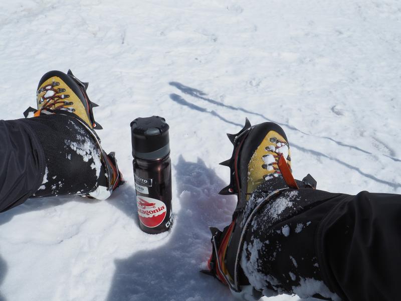 避難小屋辺りで風を避けながら簡単に昼休憩。上空の風も出てきたようなので名残惜しい景色ですが下山します。樹林帯の下りで標高が下がっていくとどんどん暑くなって最後は上半身はドライレイヤーとベースレイヤーのみになってました。上半身、下半身ともに今回のレイヤリングでは保温が過剰でしたね。