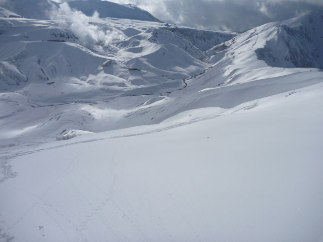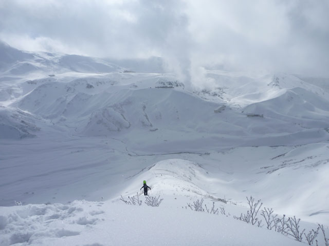 - 【1日目】室堂バスターミナル(10:20)→雷鳥平着(11:10)雷鳥平発(12:30)→雷鳥沢2500m付近(14:00)→雷鳥平へ滑走→雷鳥平(14:30)ツエルト泊