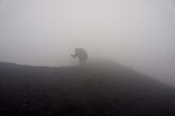 3650m付近まで登り、あと20分ほどで頂上でしたが、ガスが濃く景色は望めそうもありませんでした。