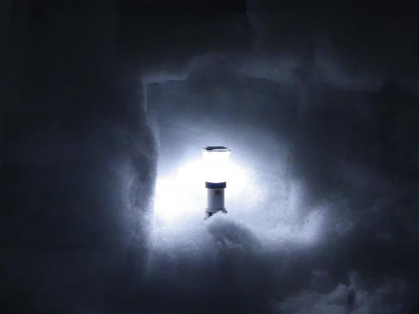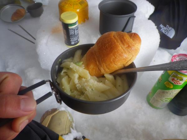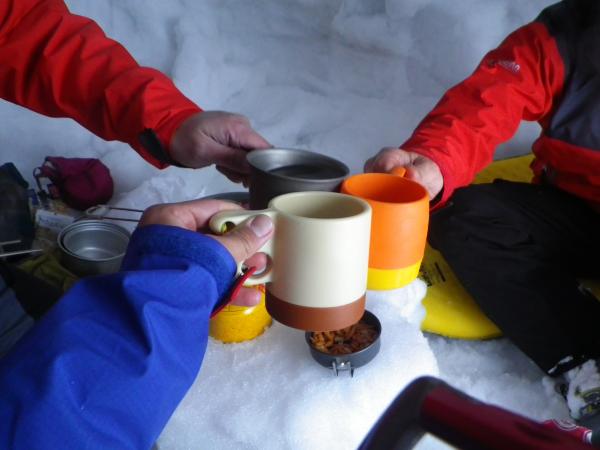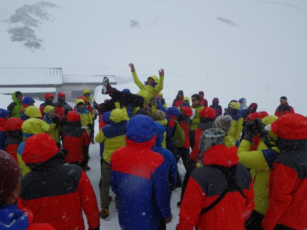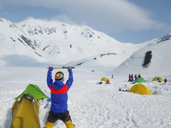 初日に作った、雪洞にて晩ご飯。その晩は荒れ次の朝はパウダーに。滑りに行きたいが、荷物をまとめ室堂へ向けて出発、到着休憩後、下山の時間までスノーボードを満喫。シーズンラストのパウダーでした。