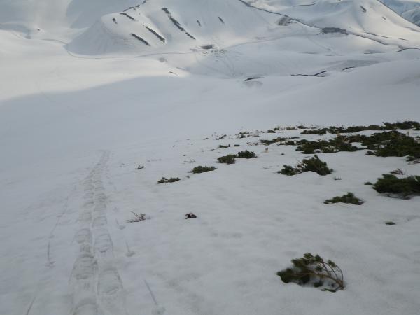 その後、天気の合間をみて夕方すぎに、雷鳥沢にて単独滑走。
