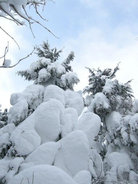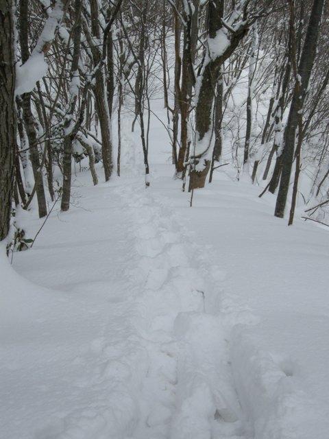 この日は藤本新道からのトレースは無く、深い積雪と樹々に着いた雪でルートを示す赤テープもほぼ見えませんでした。
