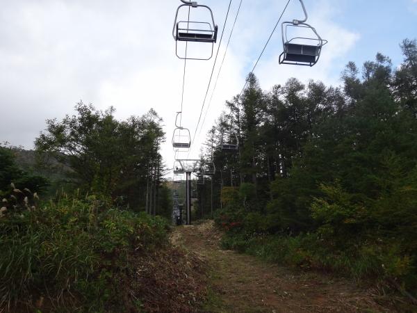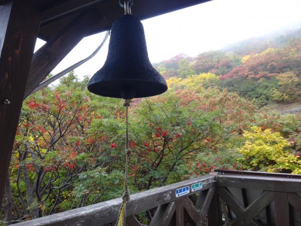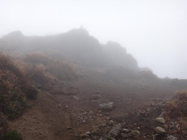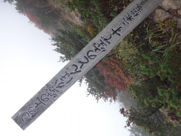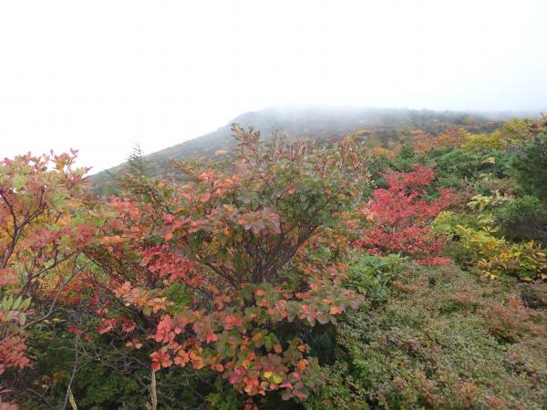 スキーリフトの下をくぐりごつごつした岩道を登ります。標高が高まるにつれ秋色が増してきましたが、同時にガスも濃くなっていきました。薬師に着いた頃にはガスで真っ白、風も強まってきました。思い描いていた絶景は拝めそうにないけれど、幸い雨は降っていなかったので何とか山頂を目指しました。