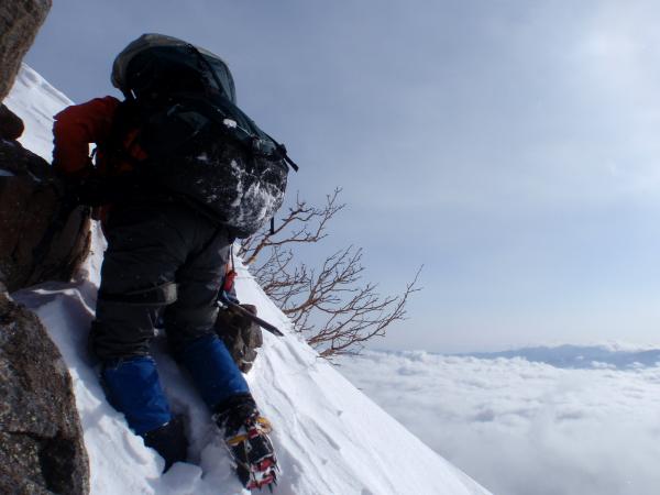 横岳周辺の鎖場は鎖が埋まっていたり、場所によっては急な雪面のトラバースを強いられるので、