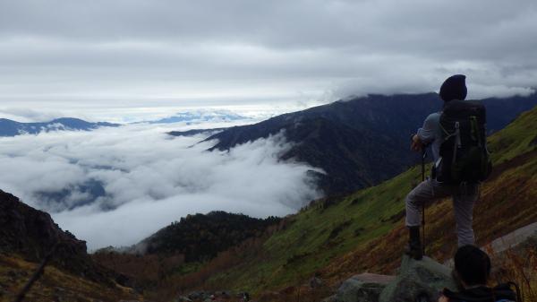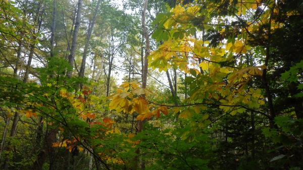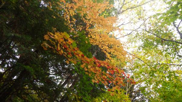新島々のバスターミナルでは雨が降ってきたものの、中の湯では降っていなかったので登山開始!登山口の辺りから黄色く色づいた木々が見られます。そんな木を眺めながら、最初は樹林帯の中をテクテク。