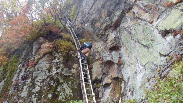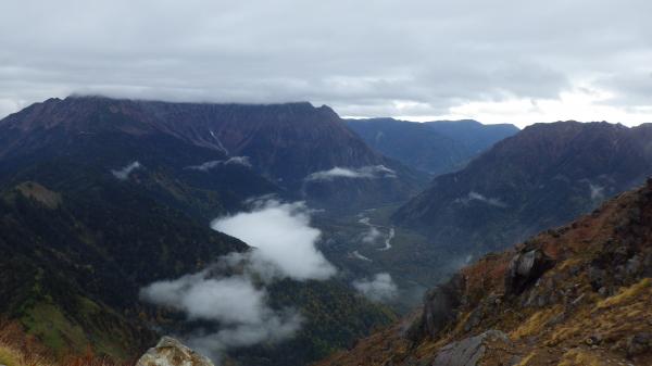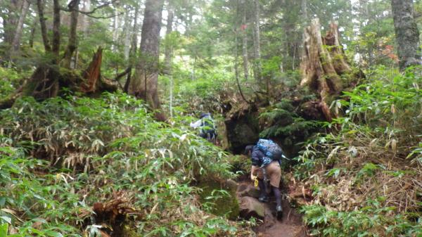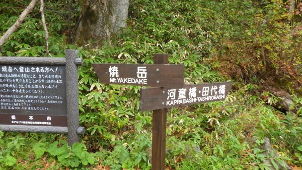 焼岳から焼岳小屋までの道は北道と同じようなゴロゴロした岩場です。小屋から上高地までの道のりは樹林帯に入ったあたりから急になります。ハシゴが5か所ほど、鎖場やロープノ張ってある個所もいくつかりました。どれもしっかりとしてるので安心して使えます。そこを下ると笹原の中をゆるゆると下って登山口へ。途中にはキレイな紅葉とでっかいナラ?ブナ?の木が見られます。