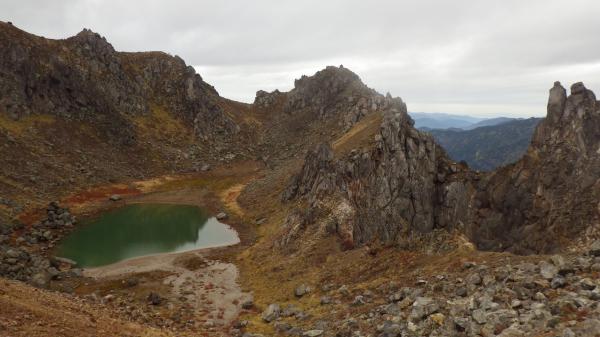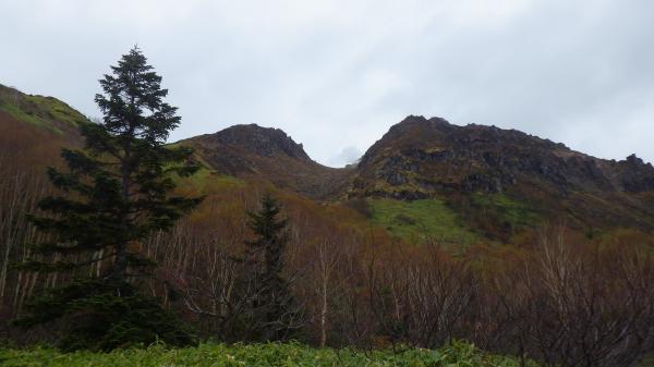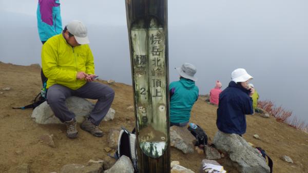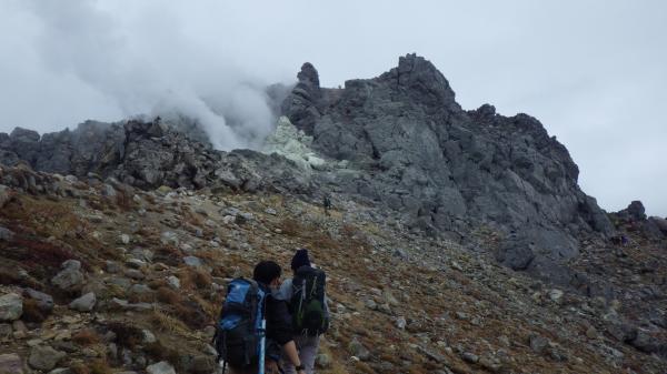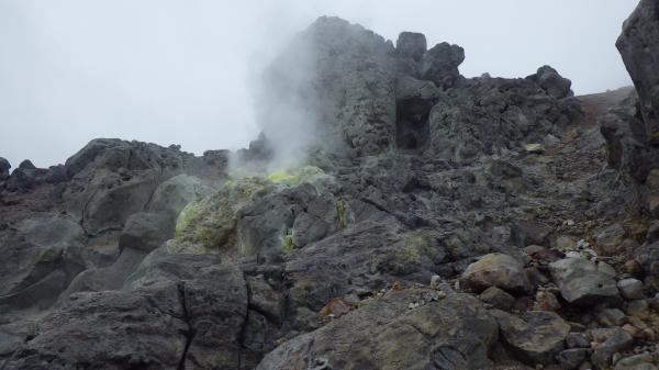 広場から山頂まではゴロゴロした岩場。途中岩に標高がペイントされてます。鞍部に近づくにつれて硫黄の何ともいえない香りが強くなってきます。鞍部につくと、下から見えていたガスの噴出口が目と鼻の先!こんなに近付いちゃっていいのか?ってくらいに近づけます。そこから回り込むようにして北峰へ。