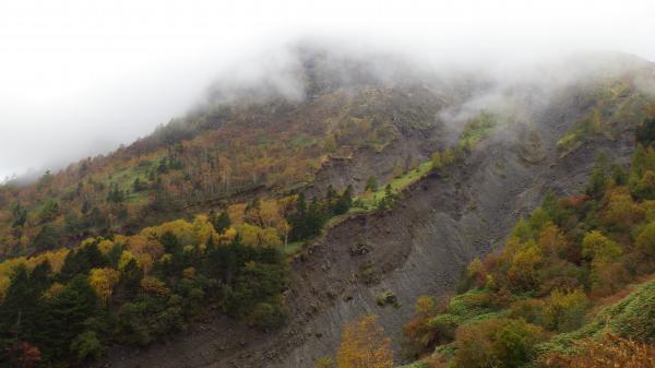 そこからこれから歩くルートと鞍部から噴き出るガスが確認できます。