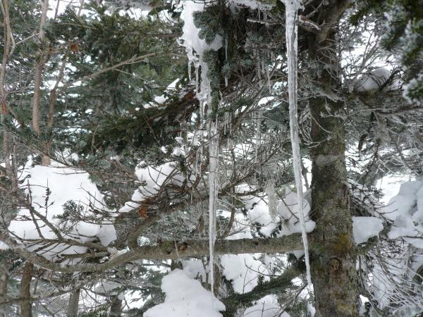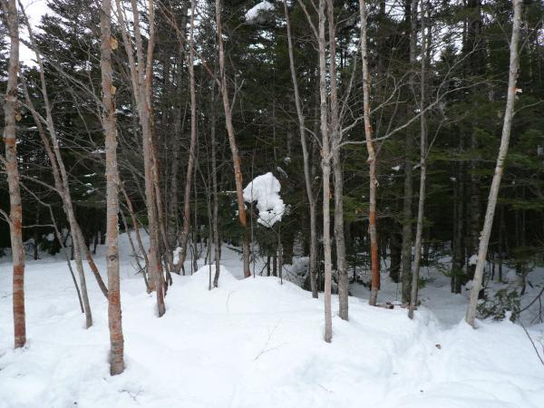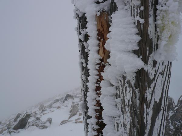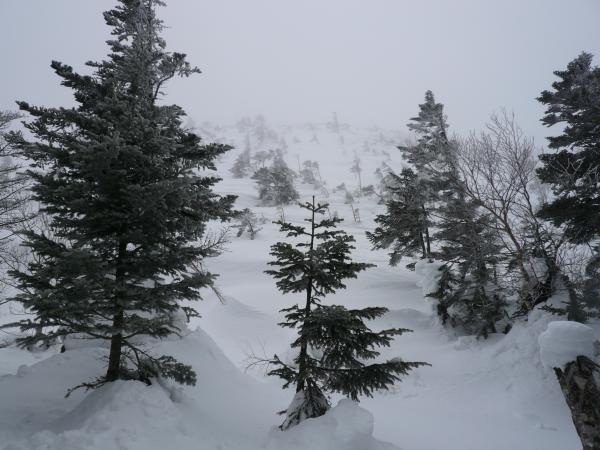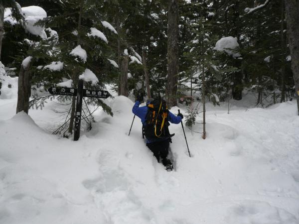 - 渋の湯から黒百合ヒュッテまではトレースがしっかりしていますので、アイゼン無しでも歩けます。小雪が舞っていましたが、樹林帯は風を感じる事も無く穏やかに歩けました。黒百合ヒュッテからアイゼンをつけました。稜線に出た途端、風が非常に強くなります。天候は常時小雪が舞う程度ながら、風が強い為かトレースはあっという間に消えてしまいます。気温は一日マイナス5度程度でしたが、風が強い所ではマイナス10度位に感じます。膝丈のラッセルをする箇所もあります。
