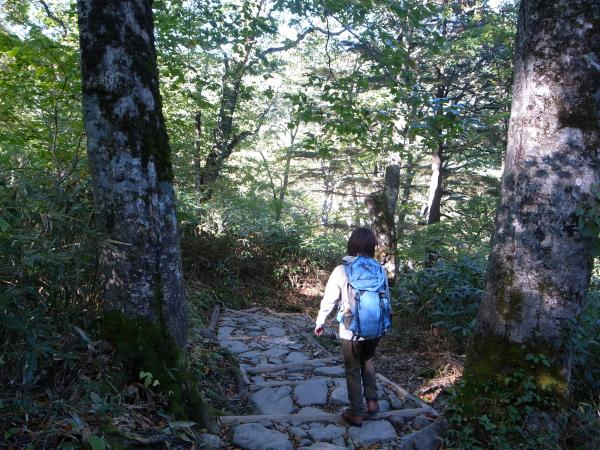 - 鳩待峠の始まりはしばらく石段と木の階段で下りです。