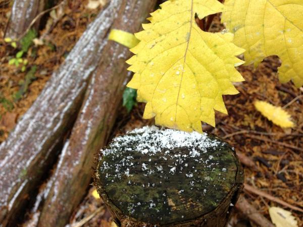 登り始めて15分ほどで雪が降り始めました!