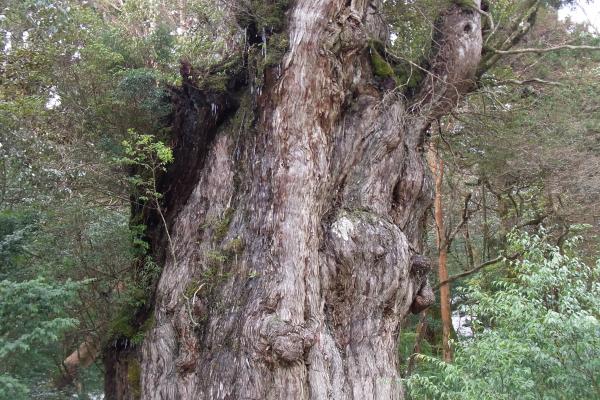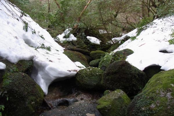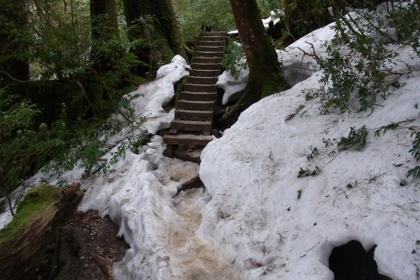 縄文杉前にはまだ雪が残っていて、杉につららがありました。