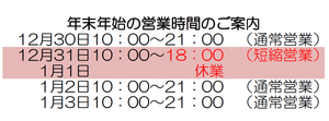 年末年始の営業時間をお知らせいたします。 12月31日 10:00~20:...