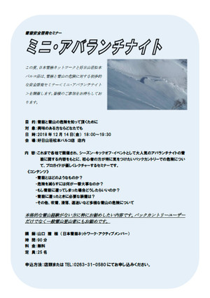 今週末開催のミニ・アバランチナイトですが、まだ若干名の空きがございます。 専門の...