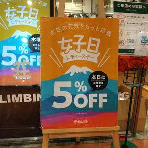 毎週木曜日はレディースデイ! 好日山荘メンバーズ会員様で 女性のお客様は5%OF...