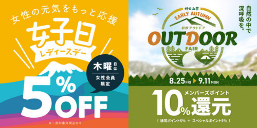 9月7日(木)は『レディースデー』 女性会員様はレジにて5%OFFとお買い得! さらに『初秋アウトドアフェア』開催中につきメンバーズポイントUP