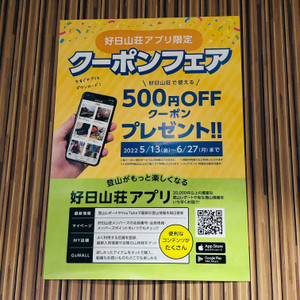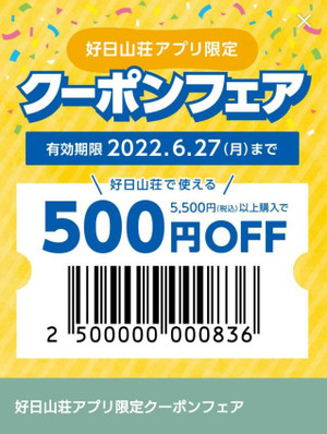 只今好日山荘では、アプリ限定のクーポンを配布中! 税込5,500円以上のお買物で...