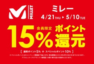ただ今、ミレーの商品は15%ポイント還元の対象です!!