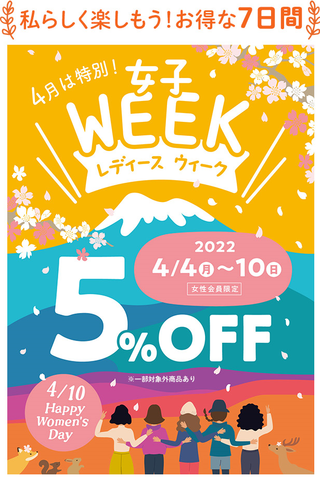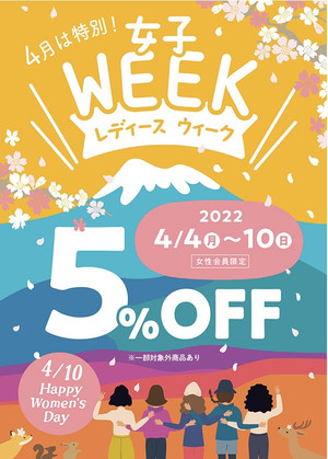 4/4(月)~4/10(日)まで「レディースウィーク」開催いたします!女性会員様は毎日5%OFFでお買物ができますよ~!!
